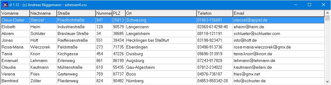 xl.exe test.cmd --f adressen4.csv --y "Vorname;Nachname;Straße;Nummer;PLZ;Ort;Telefon;Email" --n --j " ()/+-!"%=_;,:."